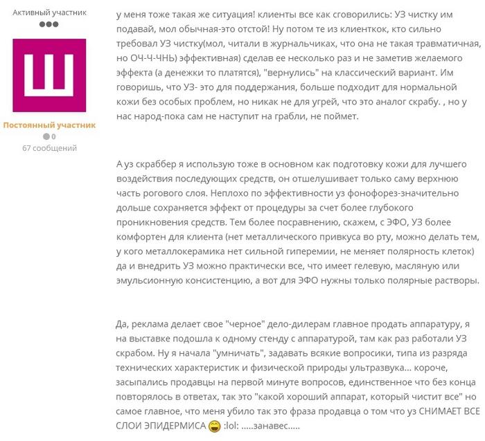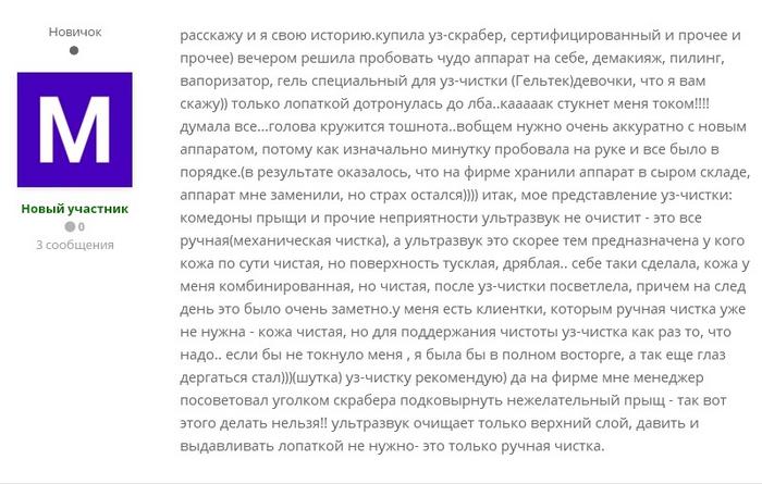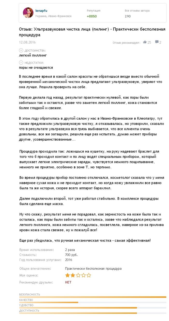 В этом отзыве косметолог предупреждает об опасности плохого оборудования, обращает внимание на соблюдение правил и норм хранения аппарата. Несмотря на это результатом чистки ультразвуком специалист остался доволен.