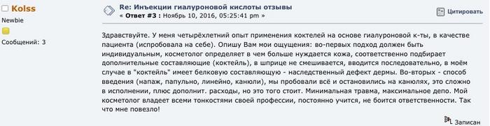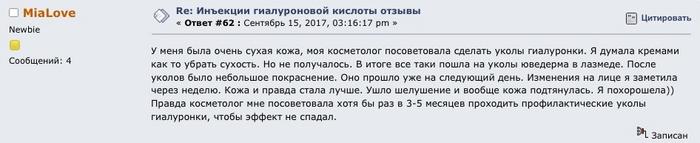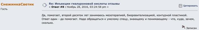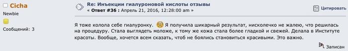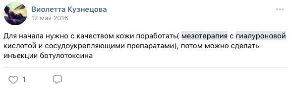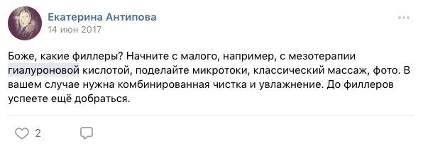 Пациентка применяет разные подходы для коррекции внешности, хвалит уколы гиалуроната.