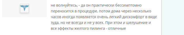 Говорит, что Kosmoteros yellow peel хорошо переносится, косметолог в следующем отзыве. По ее наблюдениям, зуд и сильный дискомфорт в постпилинговый период — явление редкое. А вот шелушится кожа хорошо.