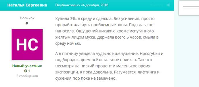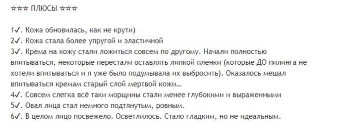 Хорошо перенесла пилинг девушка из этого отзыва. Отмечает, что после 5-часового воздействия кожа начала шелушиться, а далее — заметно обновилась. Эффекта сужения пор и лифтинга не заметила. Наносила средство самостоятельно, поскольку сама является косметологом.